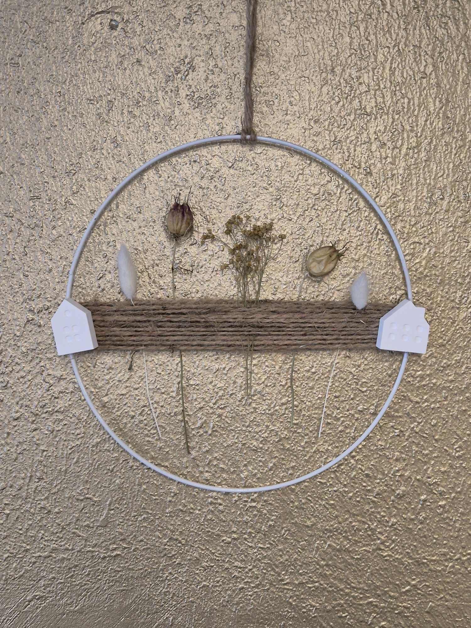 Leuke decoring met 2 huisjes van porseleingips, jute en droogbloemen. De ring is 25cm doorsnede.