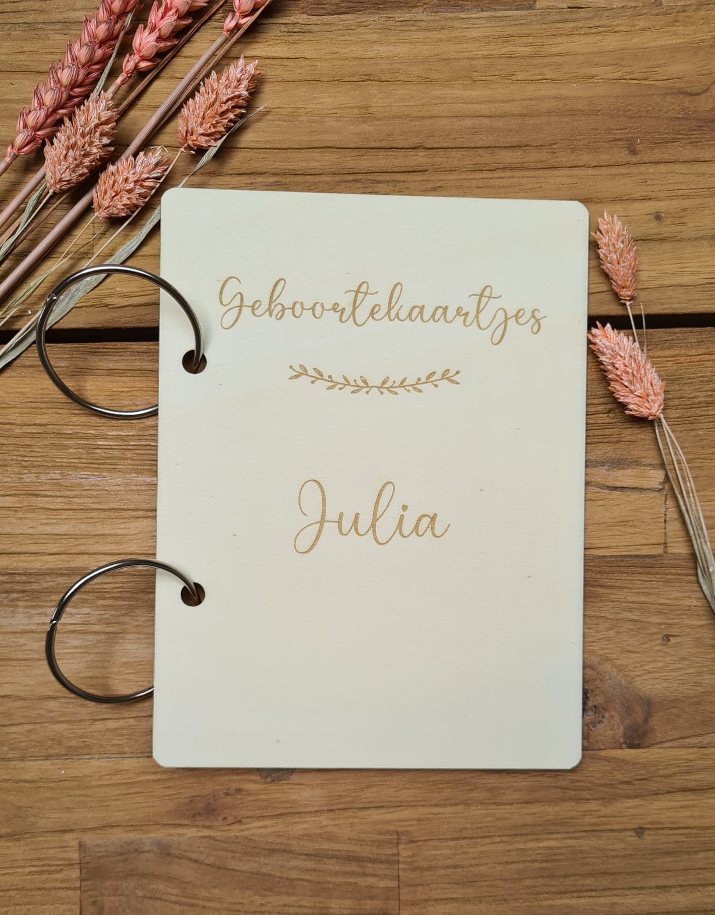 Dat kan in dit handige houten geboortekaartjes bewaarbundel.