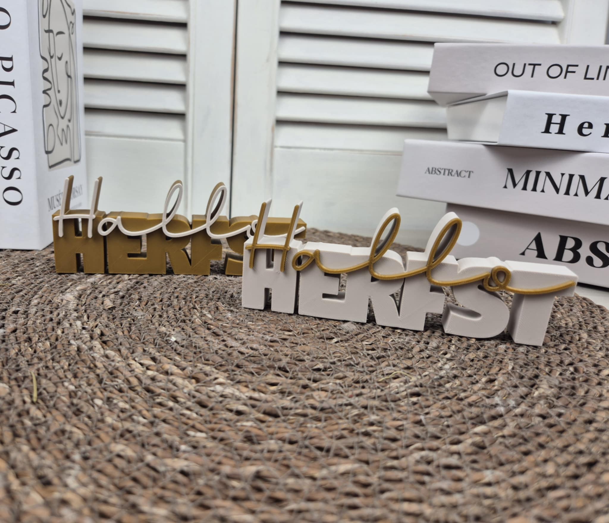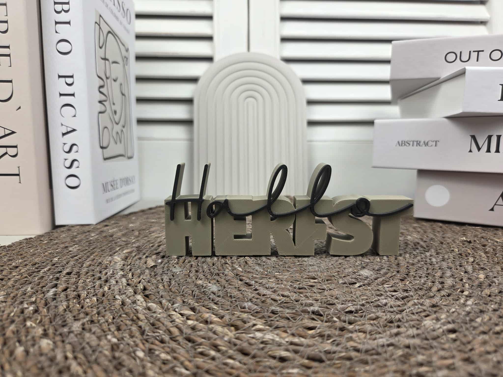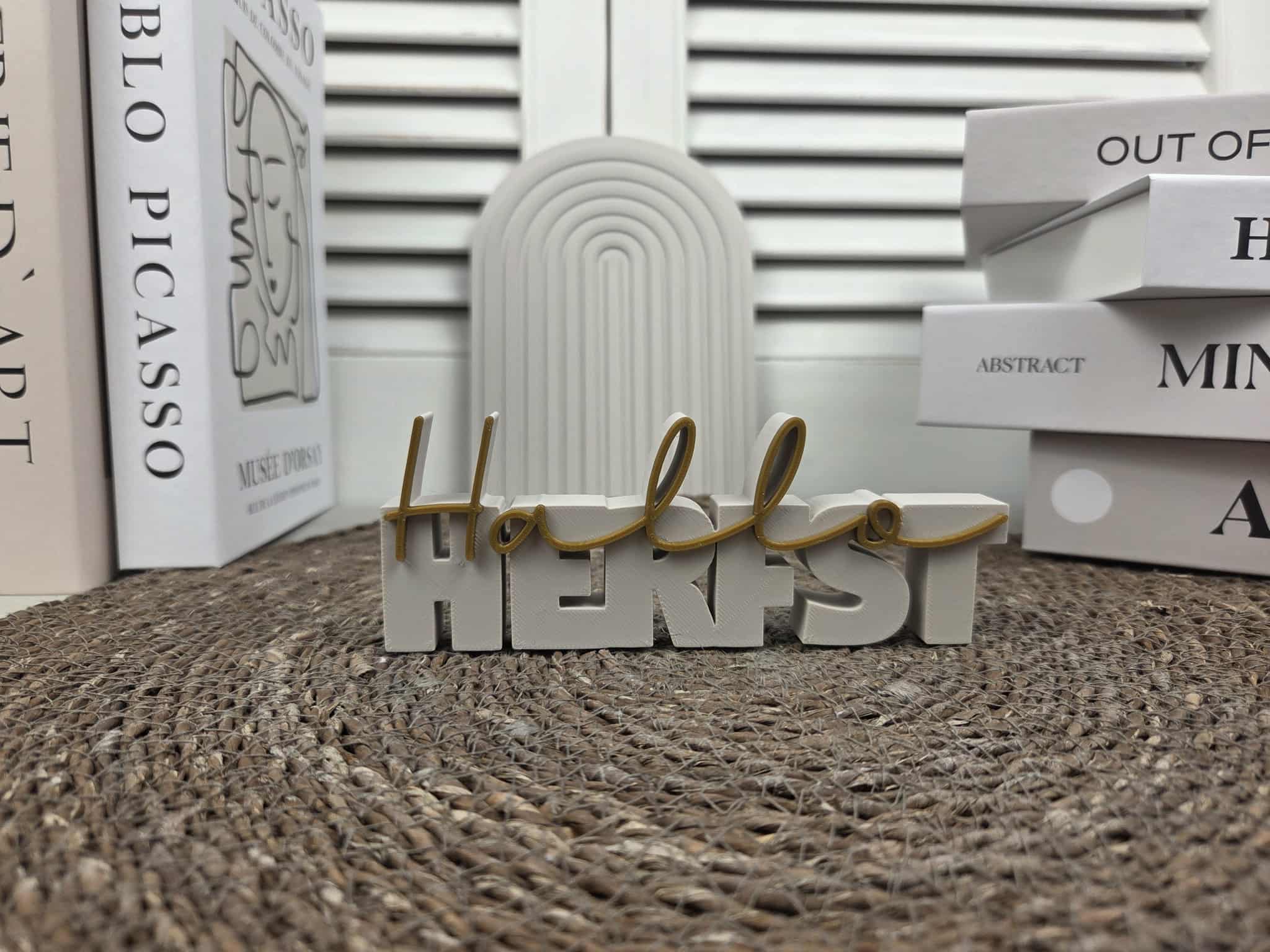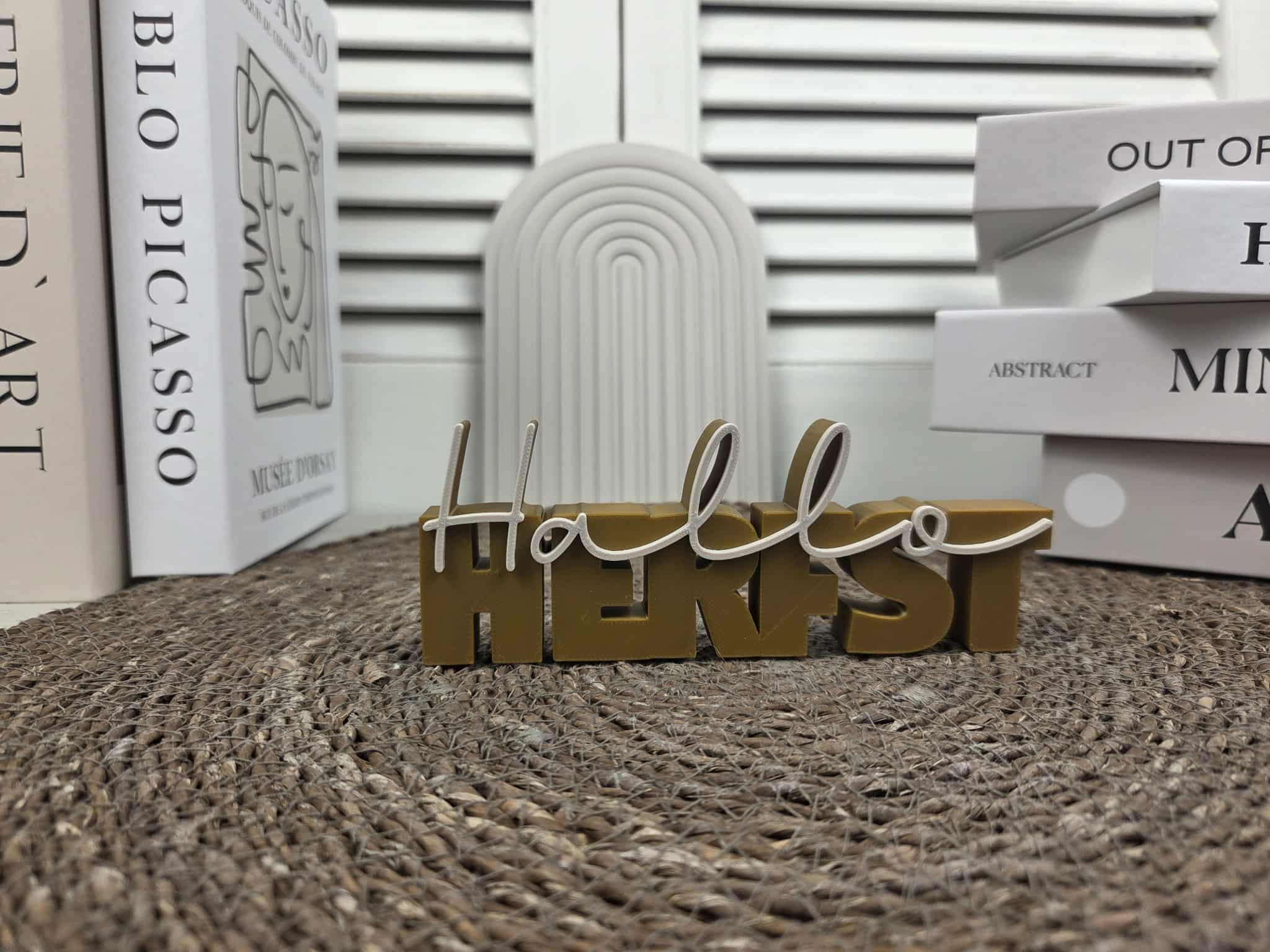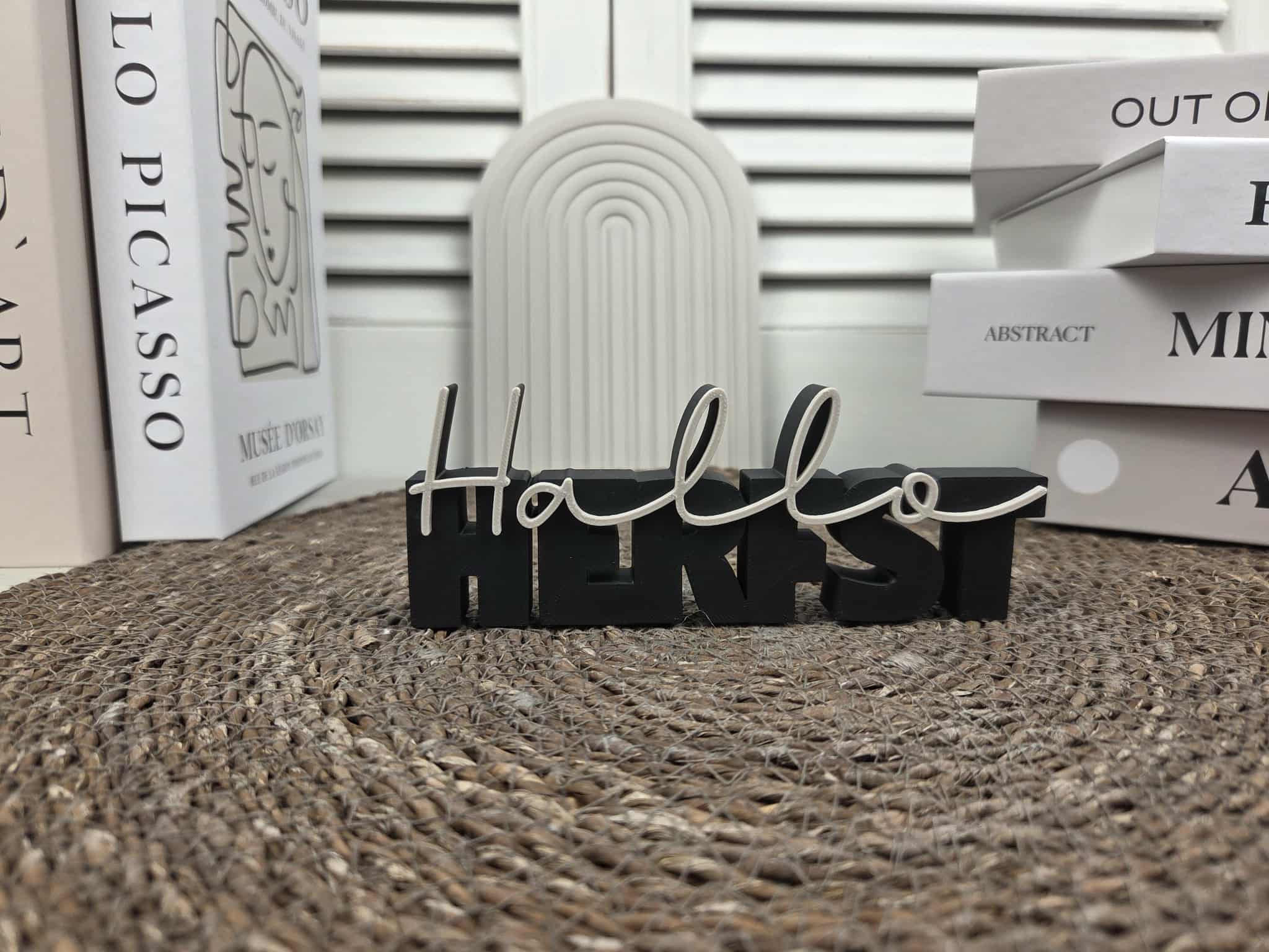 Deze unieke 3D-geprinte vrij staande tekst met Hallo herfst is 15cm en een subtiele blikvanger die natuurlijke vormen combineert met moderne technologie.