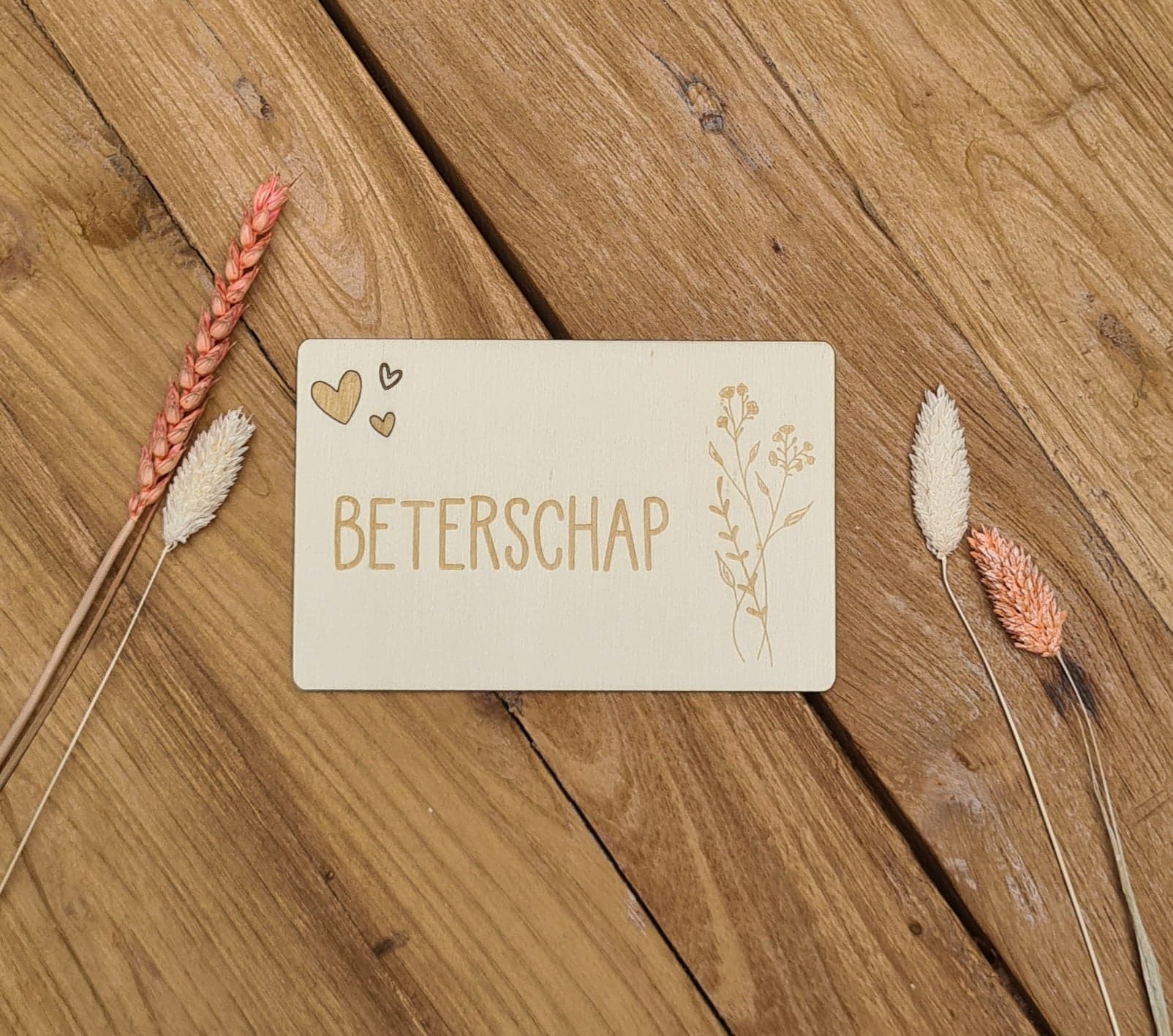 Stuur deze leuke houten kaart om iemand veel beterschap te wensen. Je kunt zelf een tekst op de achterkant laten graveren, zonder meerprijs.