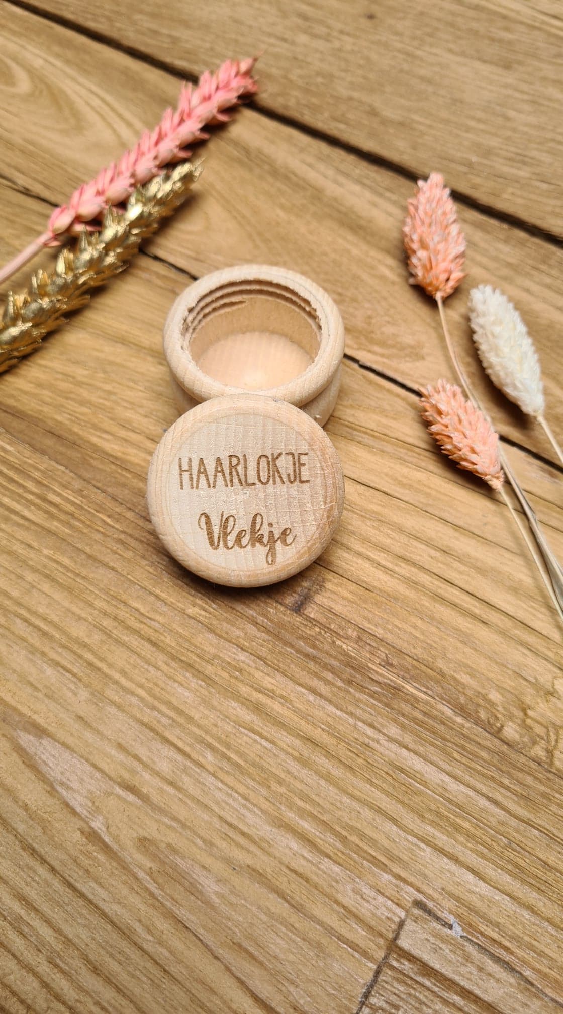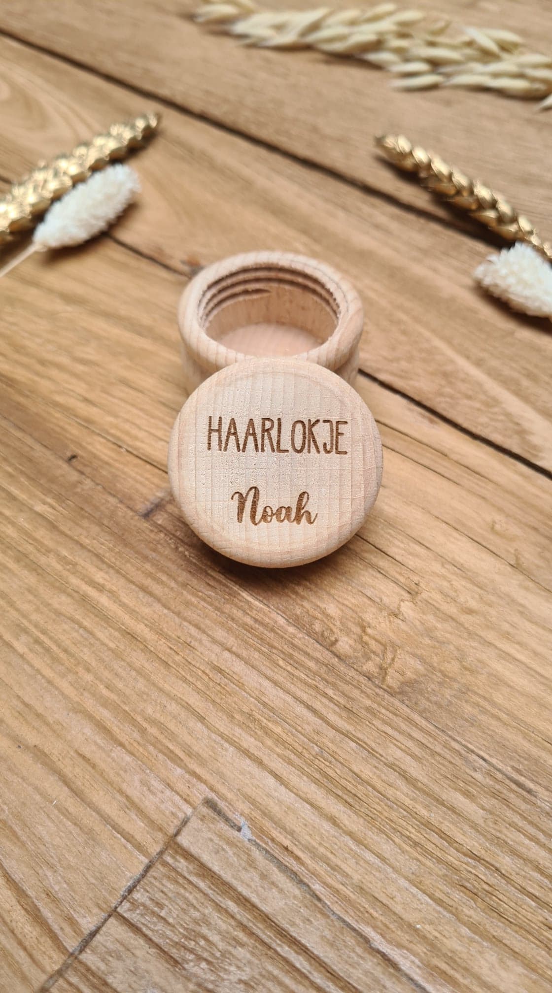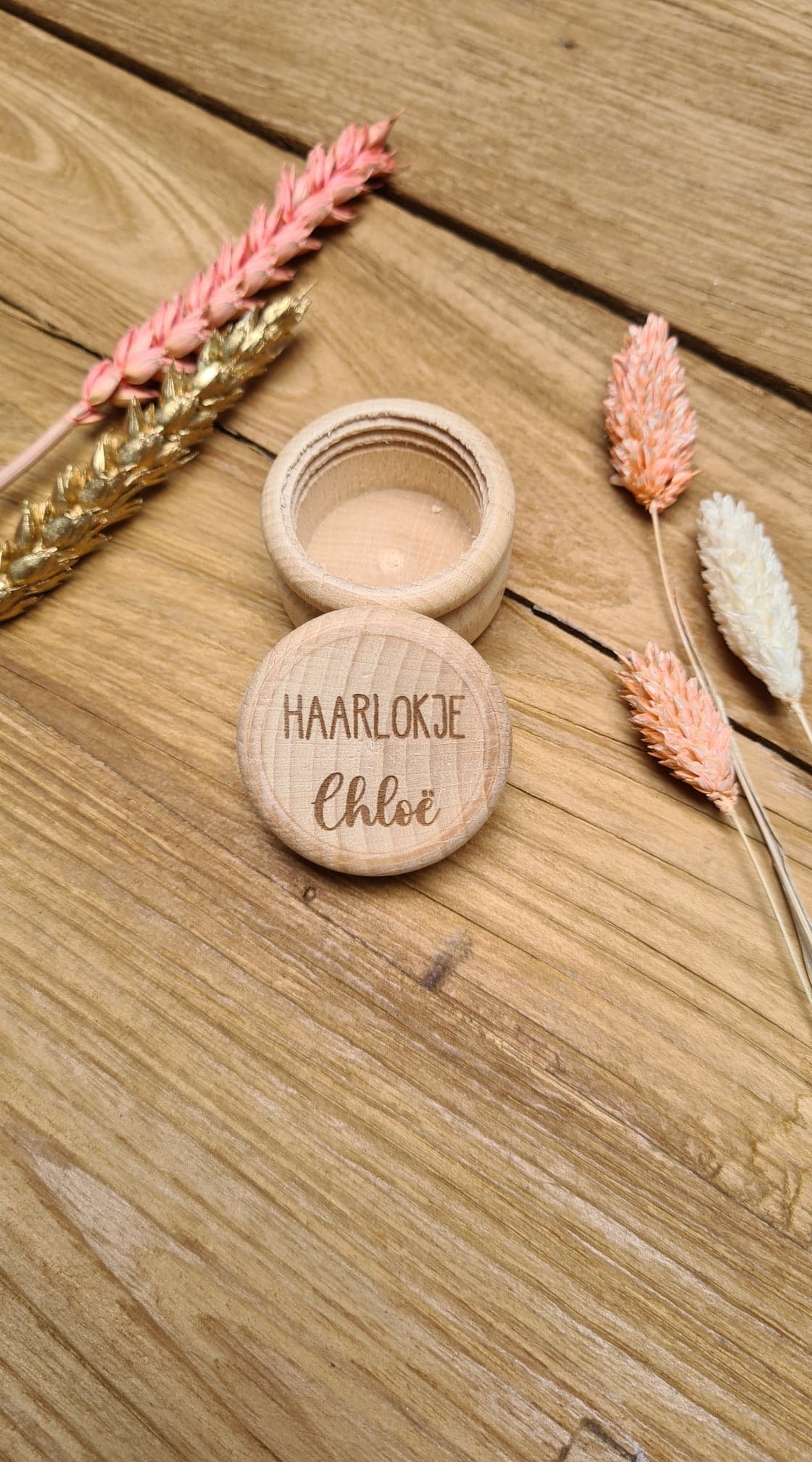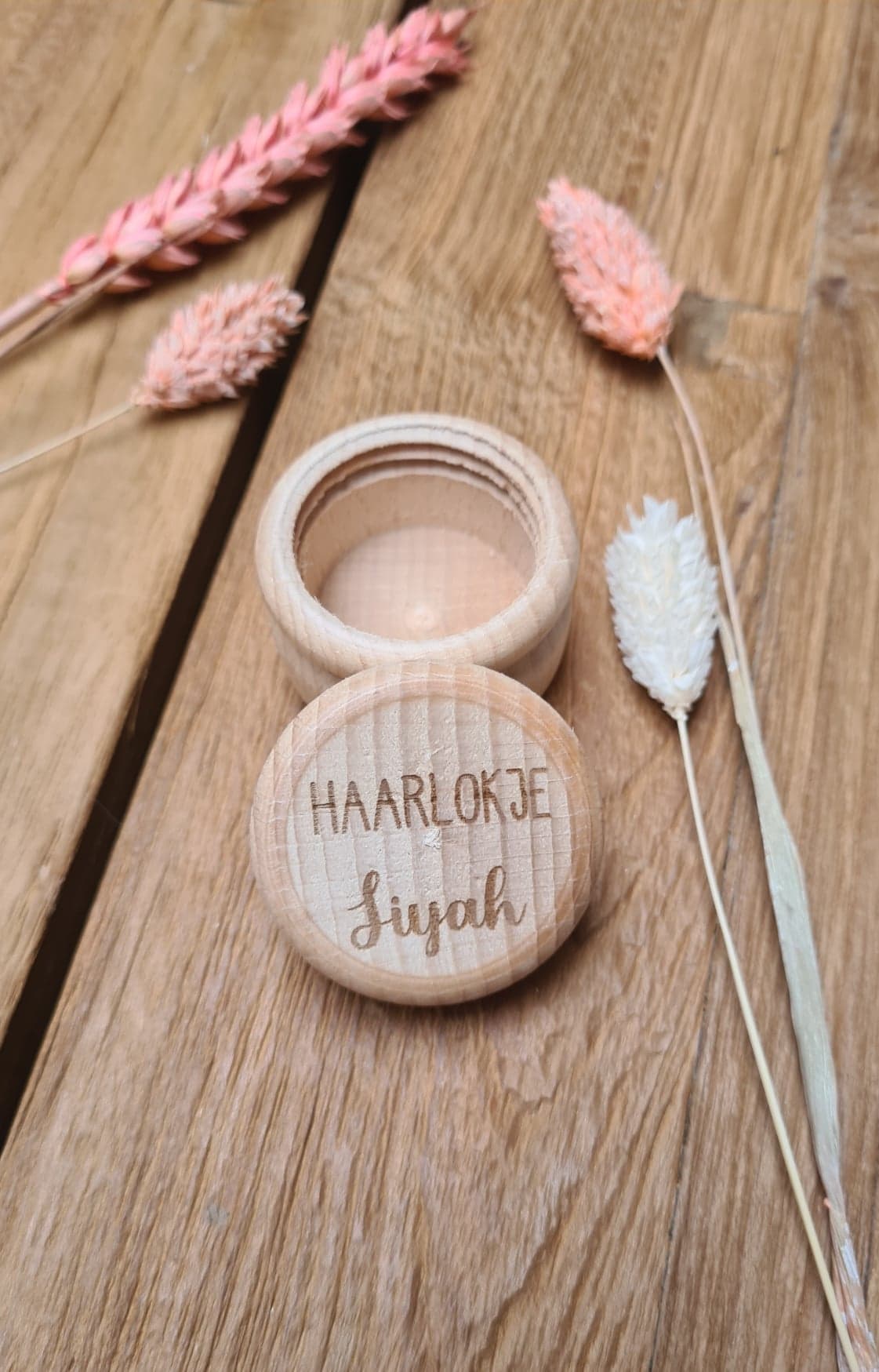 De potjes zijn van hout en bedrukt met de tekst ‘haarlokje’ en dan de naam van het kindje.