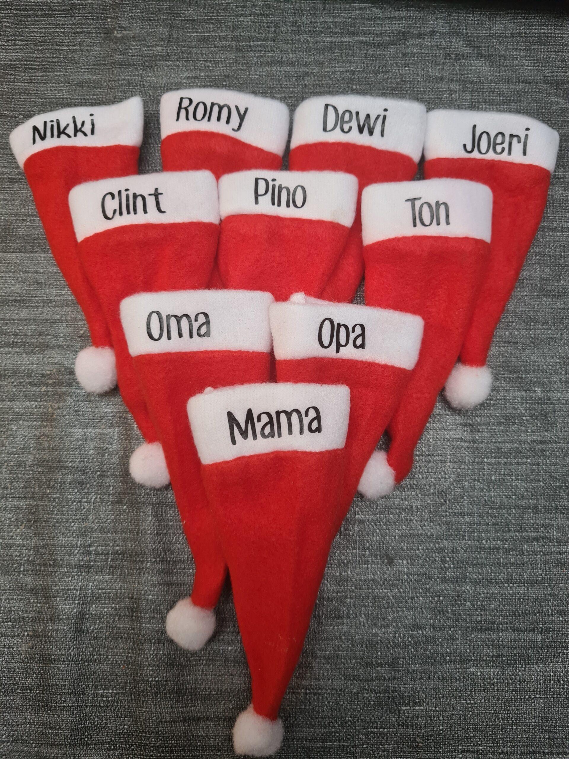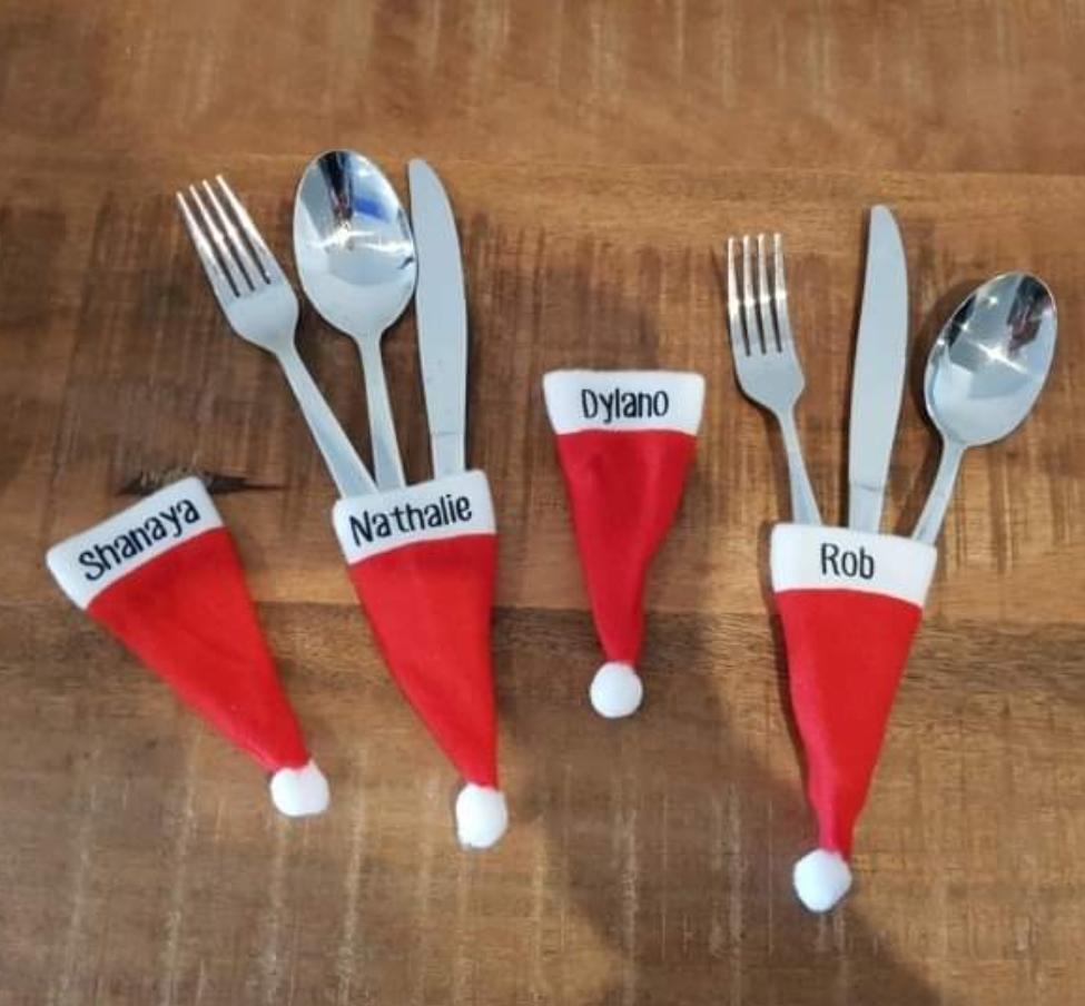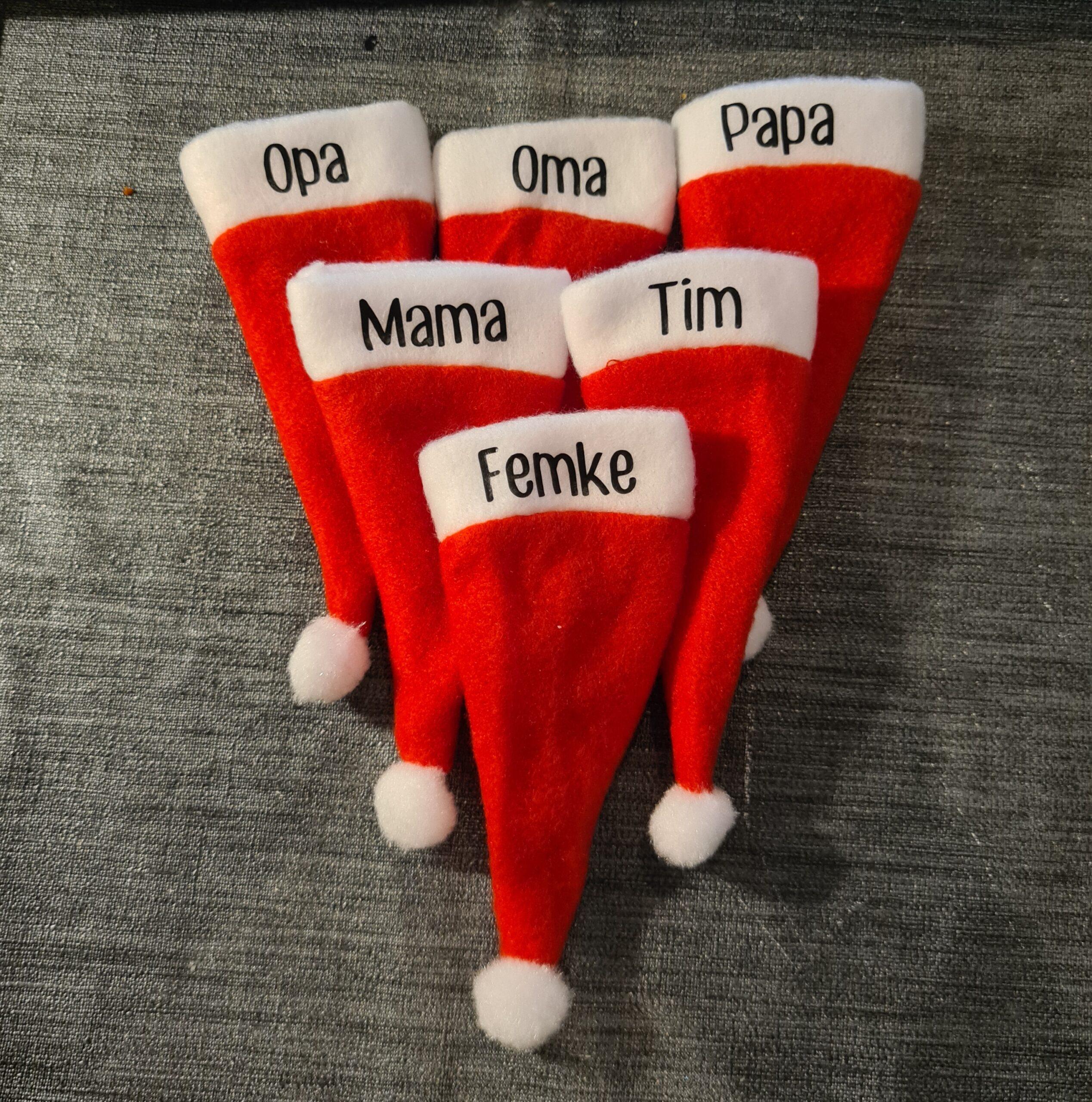 De kerstbestek mutsjes zijn een feestelijke aankleding bij het kerstdiner en zijn gepersonaliseerd met naam. De mutsjes zijn 6x11cm ongeveer.
